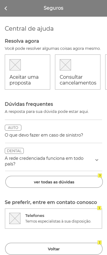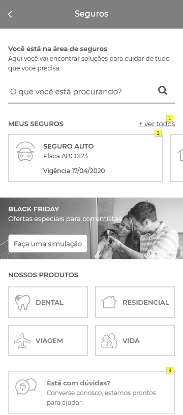 Com os feedbacks dos usuários, a equipe se reuniu e discutiu as propostas, chegamos então a primeira versão da tela inicial da área de seguros.